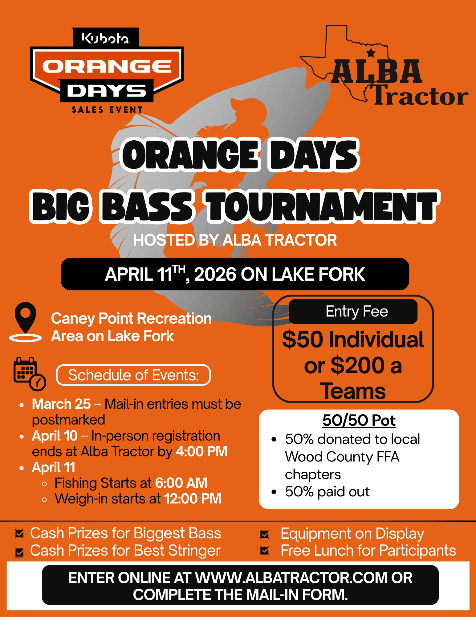 Join us for the Orange Days Big Bass Tournament on Lake Fork as part of Kubota Orange Days. This one-day fishing tournament brings together individuals and teams for a competitive event that also supports local youth programs.
