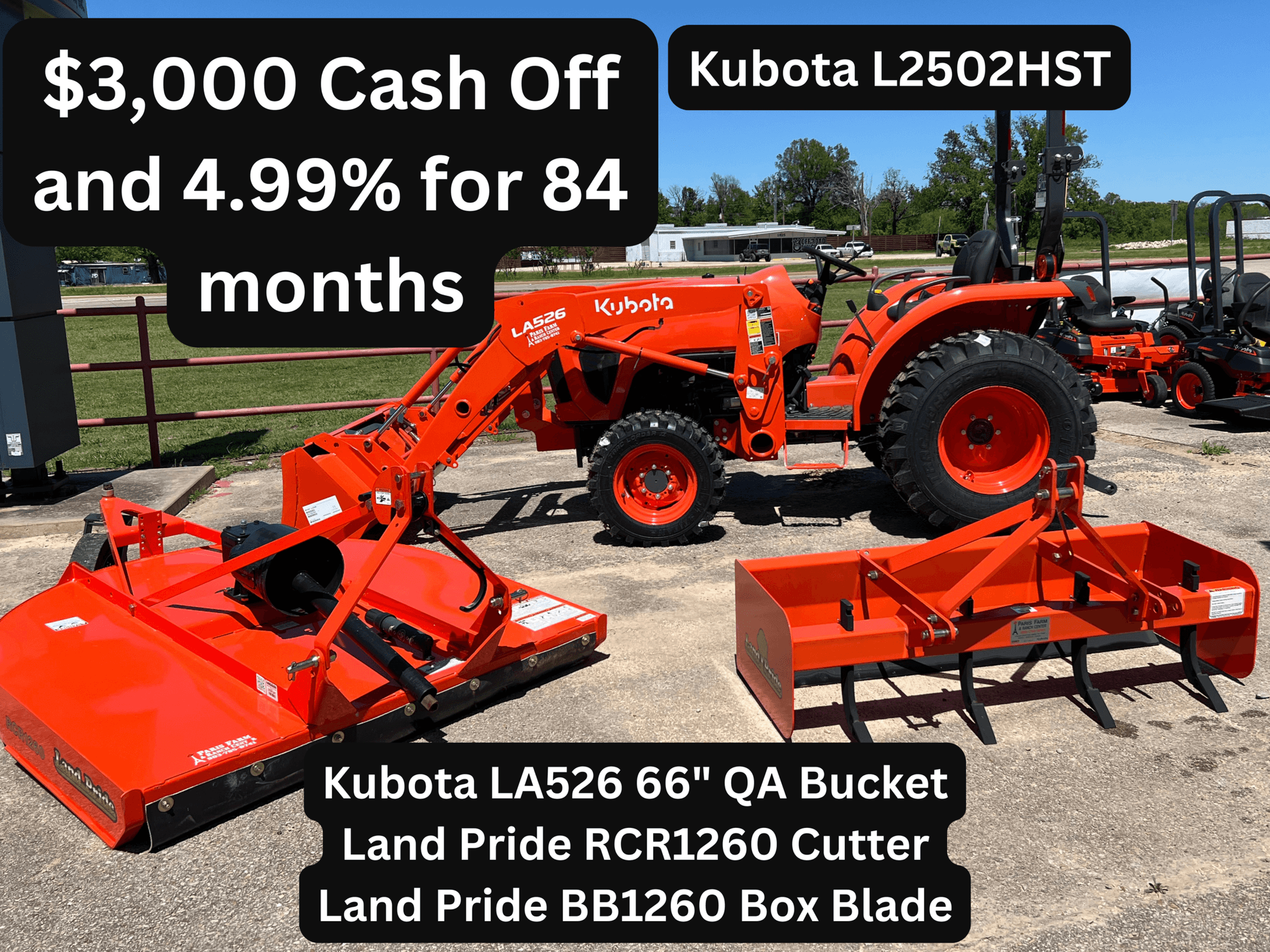 * Package prices expire 06/30/2026. Financing is subject to approval with Kubota Credit Corporation. Package payments are calculated with 4.99% interest for 84 months and $3,000 cash off. See package page for more details. Taxes and insurance are not included in the package payments shown. See dealer for more information.